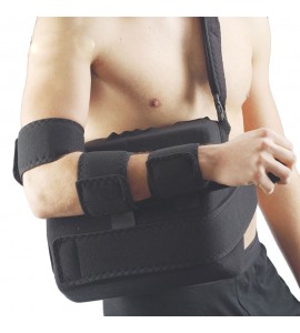 Diese orthopädische Armfixierung aus speziellen 'Auraterry' Schwamm-Material stellt die Ruhigstellung der Schulter und des Armes zwischen 45 und 60 Grad sicher, um die Bildung von Adhäsionen und Drücken des subacromialen Bereiches zu verhindern. Der Ball für die Rehabilitation trainiert die Unterarmmuskulatur und fördert die Durchblutung.