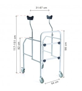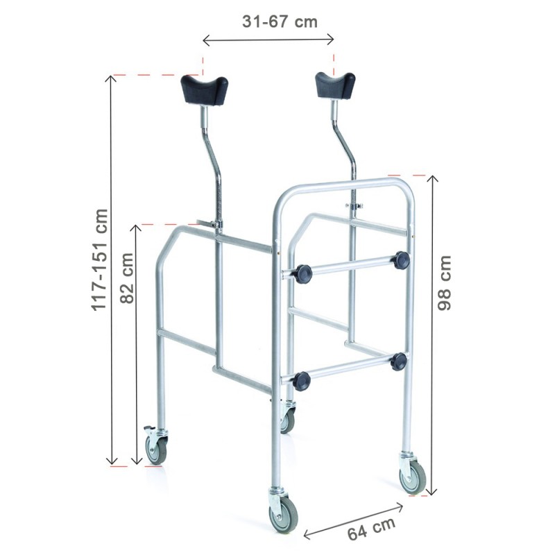 Des Weiteren ist diese Gehhilfe mit in Höhe, Breite und Tiefe verstellbaren Unterarmstützen ausgestattet, von einer minimalen Gesamthöhe von 117 cm, bis zu einer maximalen Gesamthöhe von 151 cm. Der Abstand zwischen den beiden Achselstützen, und damit die Breite, kann von minimal 31 cm bis maximal 67 cm eingestellt werden. Auf diese Weise ist der Rollator an alle Körpertypen anpassbar und individuell gestaltbar.
