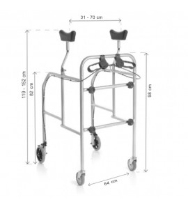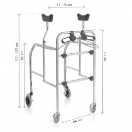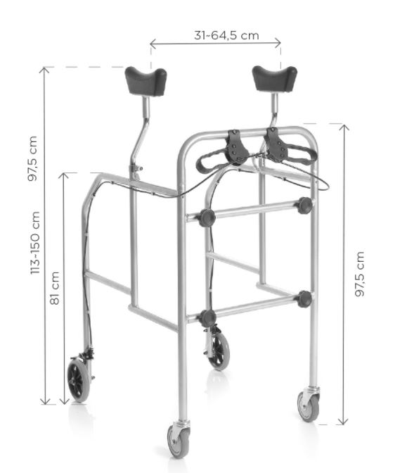 Des Weiteren ist diese Gehhilfe mit in Höhe, Breite und Tiefe verstellbaren Unterarmstützen ausgestattet, von einer minimalen Gesamthöhe von 119 cm, bis zu einer maximalen Gesamthöhe von 152 cm. Der Abstand zwischen den beiden Achselstützen, und damit die Breite, kann von minimal 31 cm bis maximal 70 cm eingestellt werden. Auf diese Weise ist der Rollator an alle Körpertypen anpassbar und individuell gestaltbar.