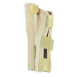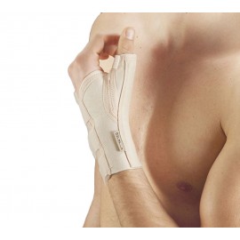 Orthopädischer Handgelenkschützer aus atmungsaktiver Baumwolle. Hautfreundliches Material verhindert Patientenbeschwerden während der Behandlungsdauer. Einstellbarer Stab mit Unterstützung aus anatomisch geformtem Aluminium, um die Bewegung des Daumens zu ermöglichen.