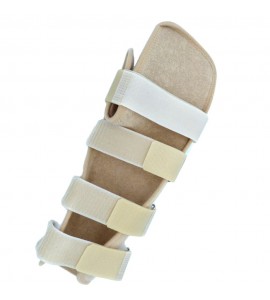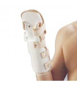 Orthese für Hand und Handgelenk aus thermoplastischem Material mit schwammigem Innenfutter. Die Schiene hält Finger und Handgelenk in einer Erholungsposition. Hält das Handgelenk fest. Kann für Ruheposition nach dem Gipsverband einer Fraktur verwendet werden und bei schmerzhaften Stellungen des Handgelenks.
