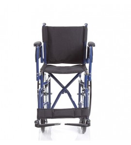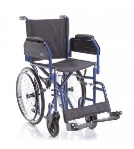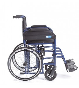 Klapprollstuhl mit Stahlgerüst. Hinterräder 20 '' (Ø 500 mm) inklusive Handlaufring angeordnet unter dem Sitz, um die Bewegungsfreiheit auch auf kleinen Raum zu gewährleisten. Sitz und Rückenlehne aus abwaschbarem Nylon.