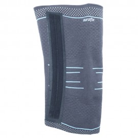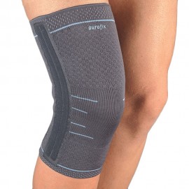 Orthopädischer Stabilisator für das Kniegelenk aus elastischem schweißminderndem Stoff Auradynamic. Er ist in drei Ebenen gegliedert: zwei sorgen für Kompression und eine, die mit karierter Textur hergestellt ist, hat eine Massagefunktion und ist mit rutschfesten Silikonbändern ausgestattet. Gewährleistet ein Maximum an Komfort während der Behandlung. Die beiden Spiralen, medial (innen) und lateral (außen), sorgen für mehr Stabilität.