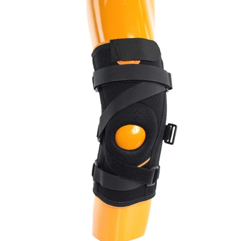 Knieschützer aus Neopren, anatomisch geformt. Es unterstützt die Kniescheibe und ist vorne offen. Die inneren und äußeren Spiralen ermöglichen die allgemeine Gelenkstabilität des Knies. Die Kreuzgurte stabilisieren das vordere Kreuzband und die Kniescheibe.