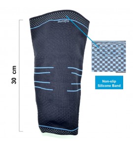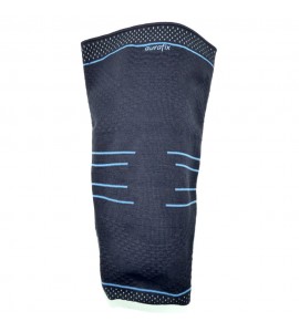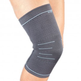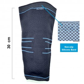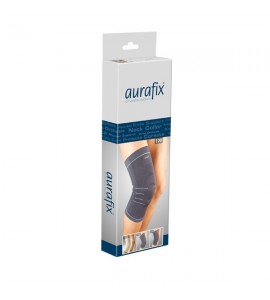 Elastische schweißmindernde Kniebandage aus Stoff Auradynamic. Er ist in drei Ebenen gegliedert: zwei sorgen für Kompression und eine, die mit karierter Textur hergestellt ist, hat eine Massagefunktion und ist mit rutschfesten Silikonbändern ausgestattet. Das Produkt speichert therapeutische Wärme für eine langfristige Entlastung von Muskeln, Bändern und des umgebende Gewebe. Für den täglichen Gebrauch geeignet.