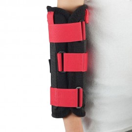 Ellenbogenfixierung für Kinder aus Schaumstoff mit Frottee gefüttert. Diese Orthese wurde speziell für Kinder entwickelt. Die beiden Aluminiumlamellen bieten Stabilisierung für den hinteren Bereich und helfen die Beugung und Dehnung zu begrenzen. Leicht verstellbar. Dank der 3-teiligen Polsterung kann dieses Produkt für beide Arme verwendet werden.