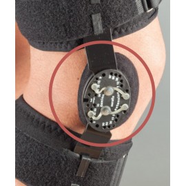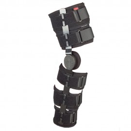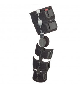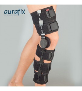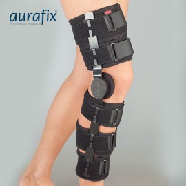 Orthopädische Kniefixierung aus weichem Schaumstoff, überzogen mit Frottee, und einer Aluminiumkonstruktion an der Außenseite. Bietet die Möglichkeit, den Winkel des Kniegelenks in Beugung und Streckung einzustellen.