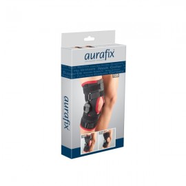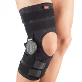 Orthopädische verstellbare Kniestütze aus Neopren, anatomisch geformt. Die Schrauben, die die Ausdehnung und die Flexion einstellen, sind so konzipiert, dass sie individuell angepasst werden können. Die innere Oberfläche des Silikonbandes verhindert das Verrutschen des Produkts.