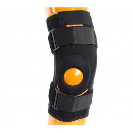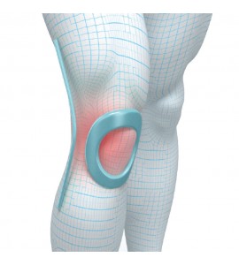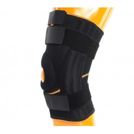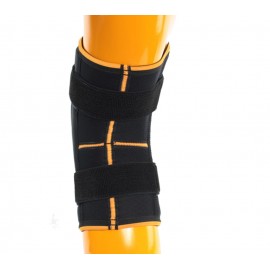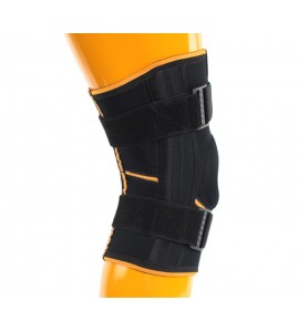 Knieschoner mit verstärktem Ring, anatomisch geformt, aus Neopren mit Jersey laminiert. Die Kniescheibe wird vom Ring unterstützt. Die seitlichen Verstärkungen und die zusätzlichen Gurte mit Klettverschluss sorgen für Stabilität und entlasten das Knie.