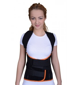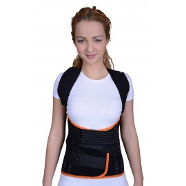 Orthopädisches Korsett hergestellt aus Baumwollgewebe. Die durchdachte Materialkombination bietet ausreichende Luftzirkulation, um Schweiß zu verhindern. Verstellbare Schultergurte, die unterhalb der Achselhöhle verlaufen und an der Brust fixiert werden, bieten zusätzliche Haltungsunterstützung im Rücken/Lendenbereich.
