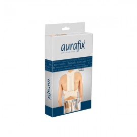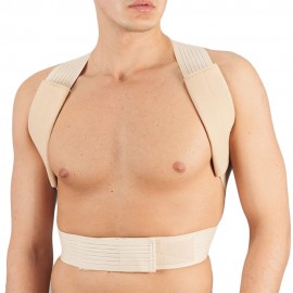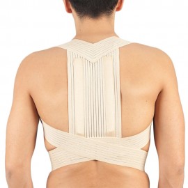 Orthopädisches Schulterkorsett aus flexiblem, atmungsaktivem und schweißhemmendem Baumwollgewebe. Beidseitige Kunststoff-Innenbügel entlang der Wirbelsäule. Flexible Schultergurte verlaufen unterhalb der Achselhöhle und verschmelzen mit den Klettverschlüssen an der Vorderseite, um eine zusätzliche Unterstützung der Körperhaltung im frontalen Lomberbereich zu bieten.